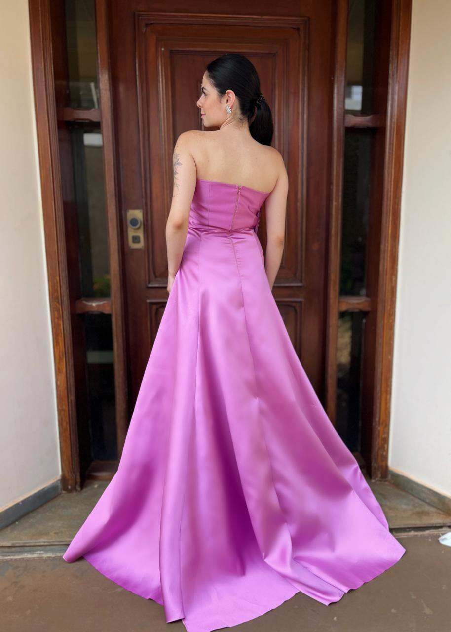 O toque do cetim, a suavidade do rosa e a delicadeza de um laço que não é apenas detalhe — é destaque. Um tomara que caia que celebra a feminilidade com graça e confiança, porque o charme está nos gestos sutis.