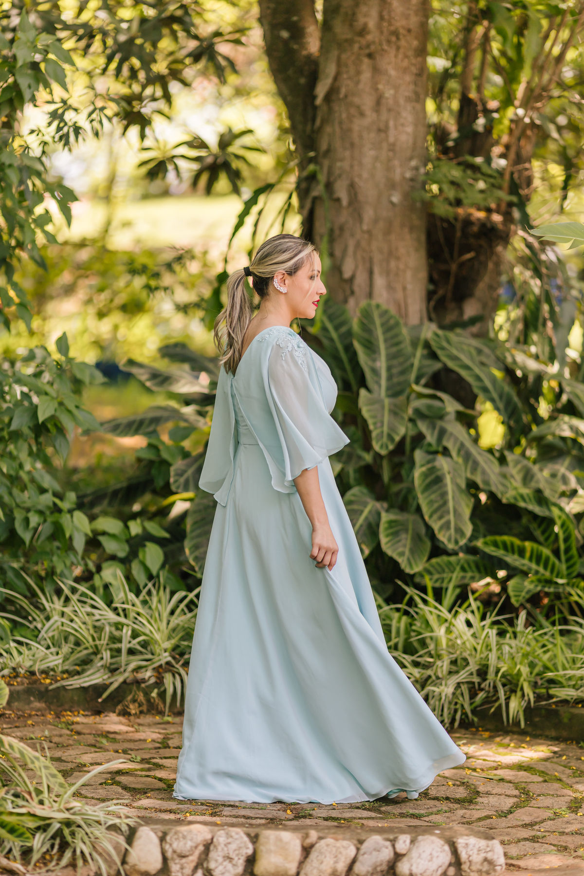Um clássico reinventado: vestido longo verde claro, com mangas fluidas que deslizam com graça. A perfeita harmonia entre sofisticação e delicadeza para ocasiões memoráveis.