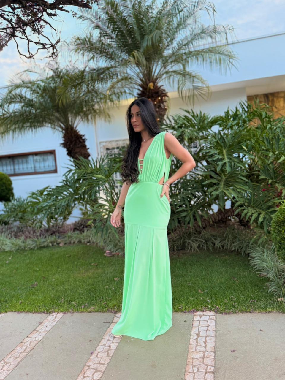 Verde em seu tom e forma mais delicado. Um decote que valoriza cada detalhe com sutileza.