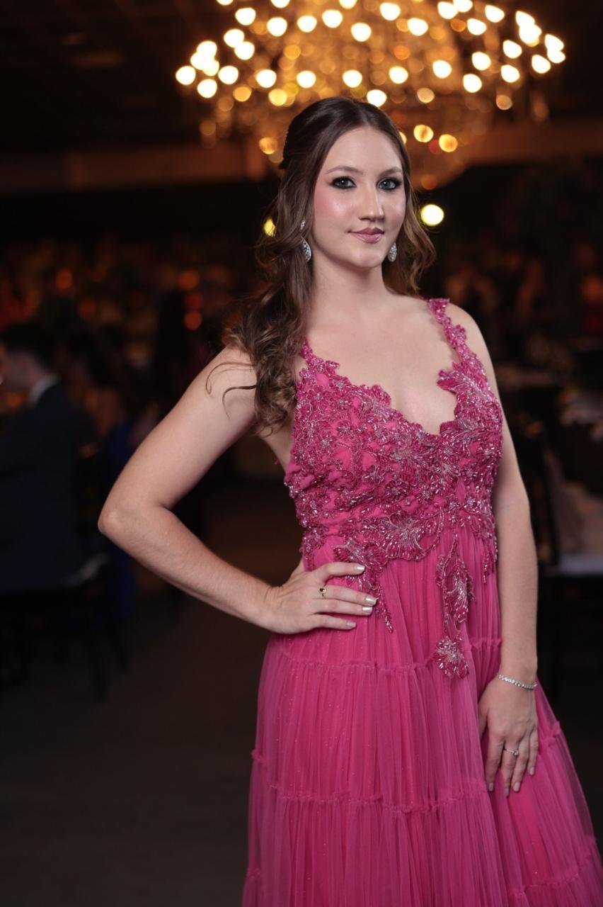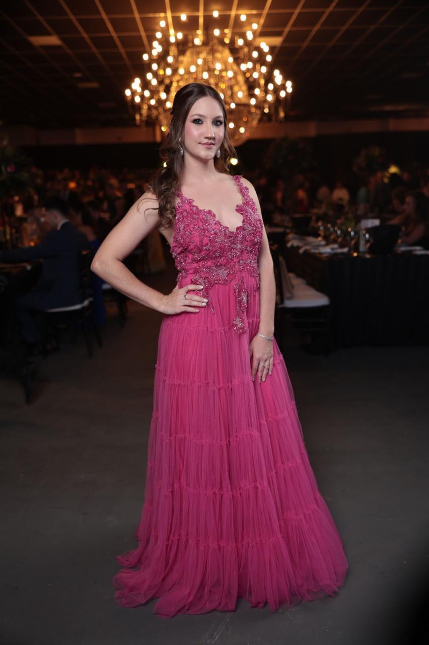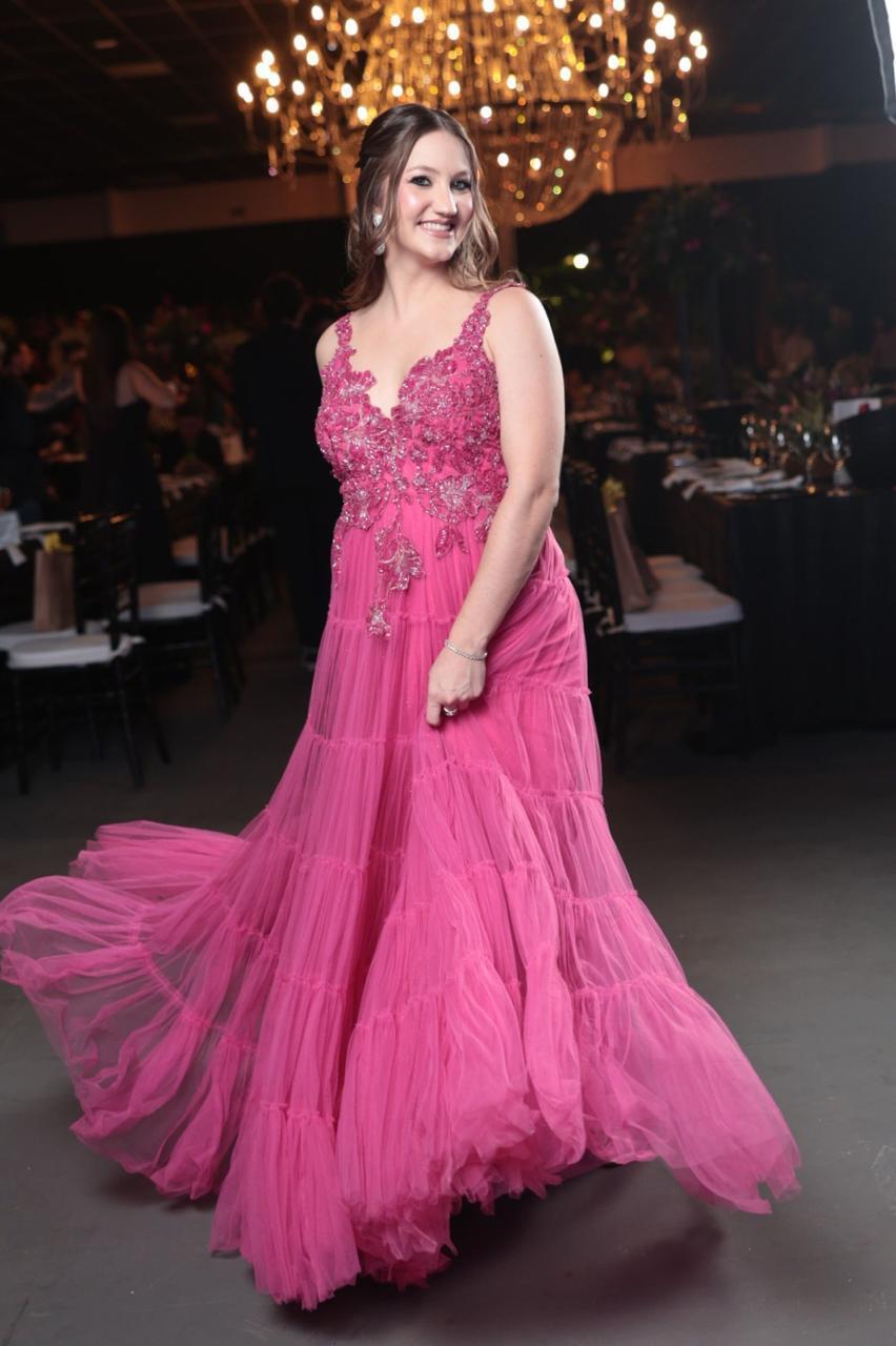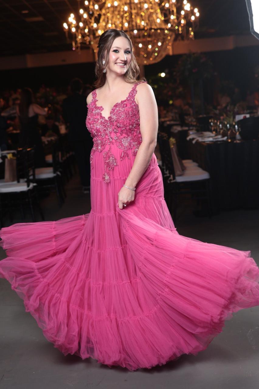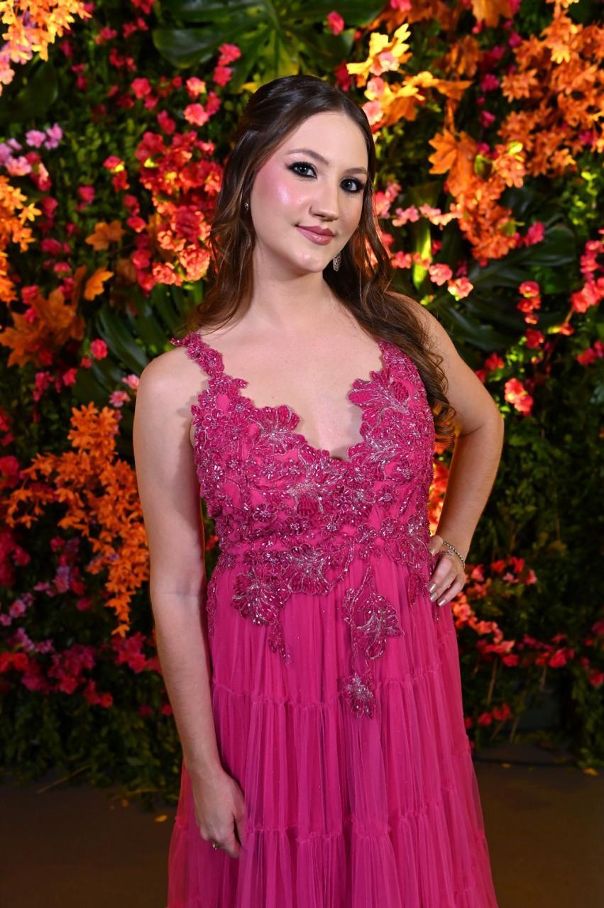 Romântico e exuberante, este vestido longo em tom pink é confeccionado em camadas de tule fluido, criando um movimento encantador. O corpete estruturado com aplicação de bordados florais delicados e pedrarias realça a feminilidade e traz um toque de sofisticação artesanal. Ideal para eventos especiais onde o charme e a presença marcante são indispensáveis.