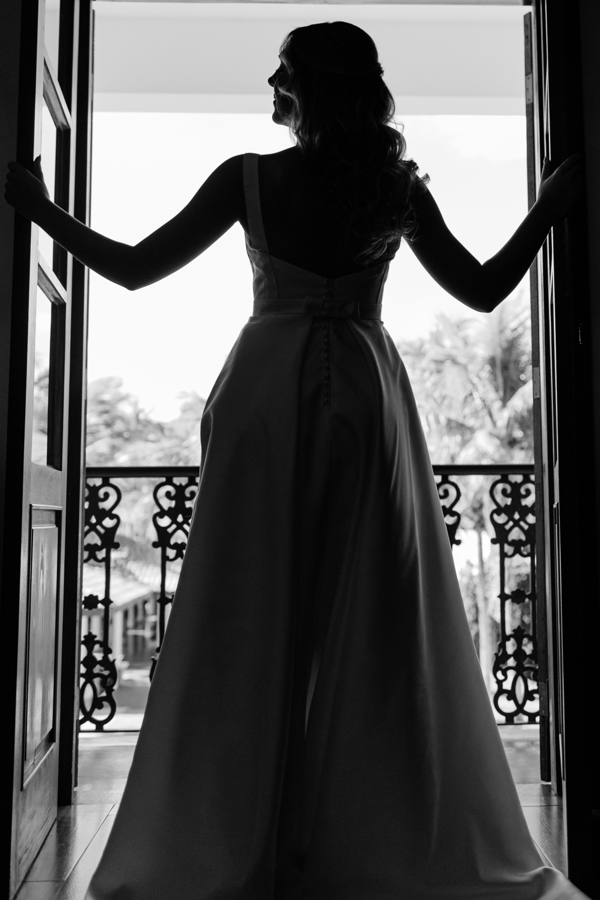A saia fluida Godê com fenda garante movimento e leveza, enquanto a fenda frontal adiciona um toque ousado na medida certa, revelando sutilmente a silhueta da noiva com graça e feminilidade. As costas abertas com delicada fileira de botões forrados reforçam o romantismo do modelo, complementando-o com charme e delicadeza.