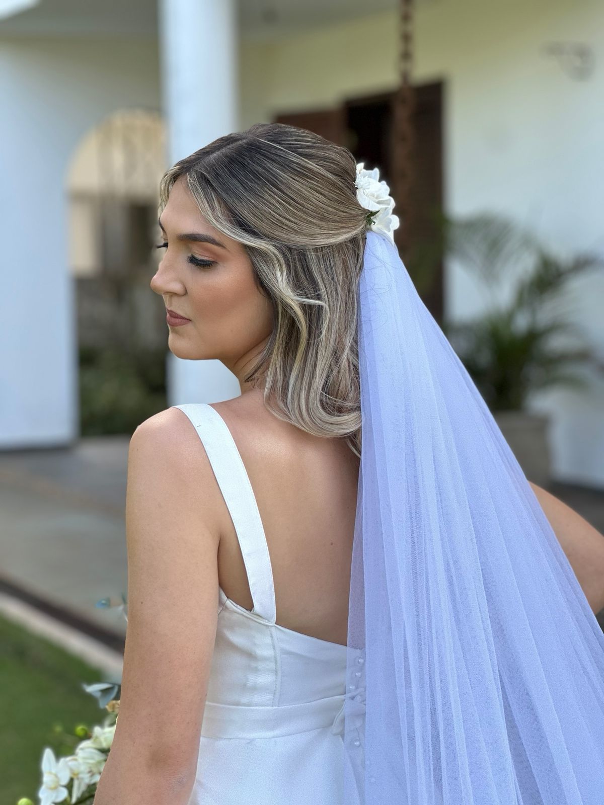 O véu longo e translúcido completa o look com suavidade e imponência, criando uma imagem inesquecível ao caminhar até o altar.