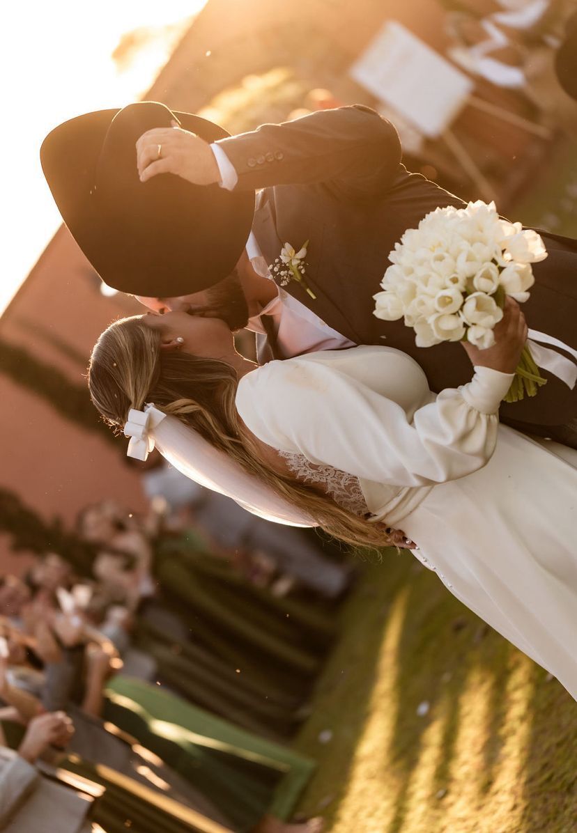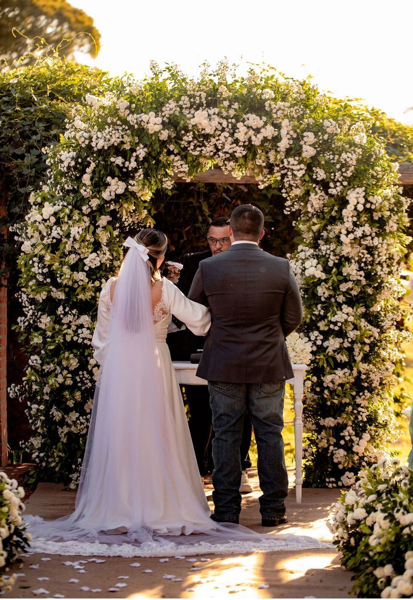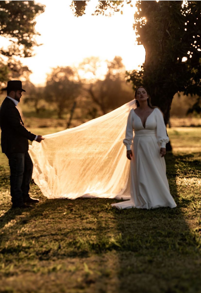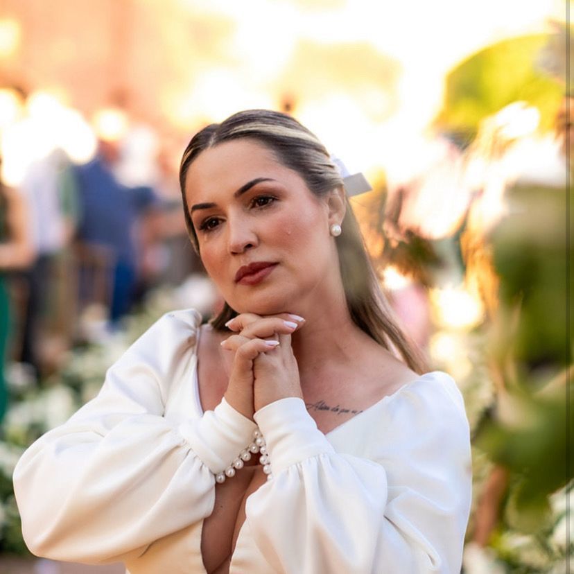 O vestido de Carla foi pensado para traduzir sua essência: clássica, delicada e marcante. As mangas bufantes trazem romantismo, enquanto o decote revela suavemente sua força feminina.