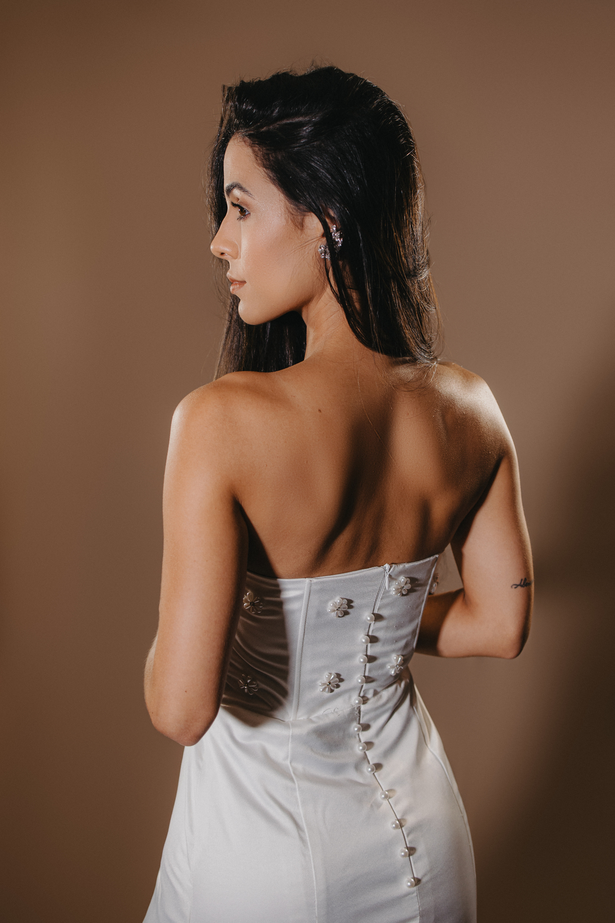 Esse vestido mistura o romântico com o contemporâneo, sendo ideal para noivas que querem fugir do tradicional sem perder a delicadeza. Ele funciona muito bem em cerimônias diurnas, mini weddings ou casamentos civis com estilo e personalidade.